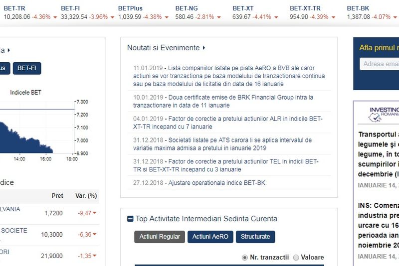 Zi neagră la Bursa de Valori Bucureşti. Indicele principal BET a încheiat ziua cu o scădere de peste 4%, cea mai mare scădere de la începutul anului şi cea mai scăzută valoare din ultimii doi ani (decembrie 2016). Banca Transilvania şi BRD au înregistrat printre cele mai mari scăderi de , -9,58% şi, respectiv, -6%,.