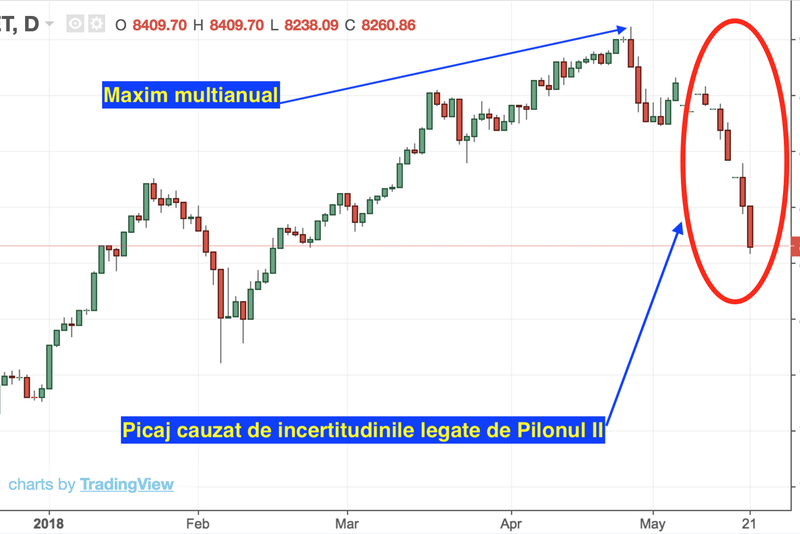 Încă o zi de scădere la Bursa de Valori București. A câta, nici nu mai contează. Amenințarea dispariției fondurilor de pensii din peisajul investițional continuă să pună presiune pe cotații.Cumpărătorii au intrat in grevă. Sunt îngrijorați de ceea ce se va întâmpla, până la urmă, cu contribuțiile la Pilonul II și care va fi soarta acestor fonduri de pensii: vor mai exista sau nu? Și, dacă da, până când și în ce condiții? Se suspendă sau nu contribuțiile pentru a doua jumătate a anului? Un set de întrebări care n-ar fi trebuit să existe niciodată. Ar fi trebuit să avem doar certitudini. Valabile pentru cel puțin 10 sau 20 de ani. Dar, deh... suntem forțați să operăm cu unica certitudine aflată la îndemână: greva cumpărătorilor.După o perioadă în care piața a consemnat scăderi de aproape 9% de la maximele multianuale înregistrate la finele lunii aprilie, debutul acestei săptămâni s-a situat, de asemenea, în teritoriu negativ. Indicele reprezentativ BET a scăzut cu 1,77% la 8.260 de puncte în timp ce indicele BET-XT a înregistrat o scădere similară la 762 de puncte.