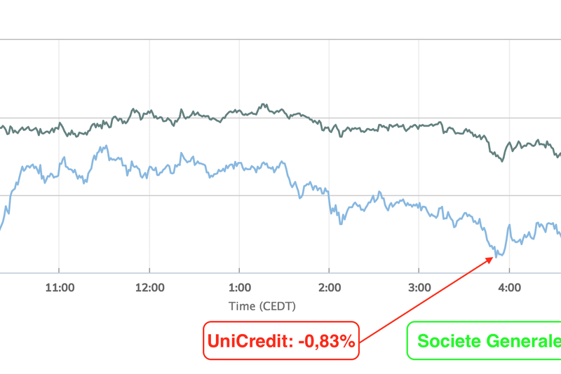 Graficul sesiunii din 4 iunie 2018 al UniCredit și Societe Generale, sursa: marketwatch.com