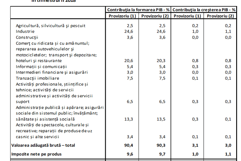 nefiind, însă, înregistrate diferențe semnificative față de varianta publicată în Comunicatul de presă nr. 226 din 7 septembrie 2018.Produsul Intern Brut estimat pentru