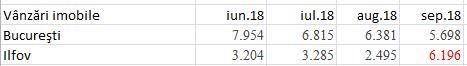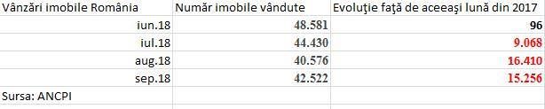 ", spune analistul imobiliar Radu Zilişteanu.Opinia sa privind efectele creșterii ROBOR este împărtășită și de către Adrian Erimescu, CEO Imobiliare.ro, care a observat că încă din al doilea trimestru al anului 2018 a început să scadă cererea pentru locuințe, la nivelul marilor orașe.Reprezentanții Imobiliare.ro spun că tendința de scădere poate fi pusă pe seama evoluțiilor din domeniul creditării: dacă anul trecut mulți români s-au grăbit să acceseze un credit Prima Casă din pricina fondurilor limitate, în al doilea trimestru din 2018 lucrurile s-au mai domolit pe fondul creșterii susținute a indicelui ROBOR, unii dintre potențialii cumpărători preferând chiar să-și amâne decizia de achiziție.În luna septembrie 2018, au fost vândute, la nivelul întregii țări, 42.522 de imobile, cu 15.256 mai puţine față de perioada similară a anului trecut (tabel jos), arată datele Agenției Naționale de Cadastru și Publicitate Imobiliară (ANCPI).