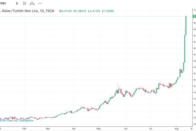 Picajul lirei turcești a trimis cotația euro în raport cu dolarul la un minim al ultimelor 13 luni și a afectat valutele piețelor emergente ca urmare a îngrijorărilor investitorilor asupra efectelor de contagiune. Leul, prin comparație cu monedele regionale zlot și forint, s-a menținut cel mai bine.Deși lira turcească a revenit ușor, luni, de la minimul istoric de 7,24 lire pentru un dolar, după ce banca centrală a țării a declarat că va oferi lichidități în sistem și ca va reduce rezervele minime obligatorii pentru bănci, moneda a rămas însă în scădere cu 10% față de sesiunea de vineri. Ea a pierdut, în 2018, mai mult de 40% din valoarea sa, așa cum reiese și din graficul următor: