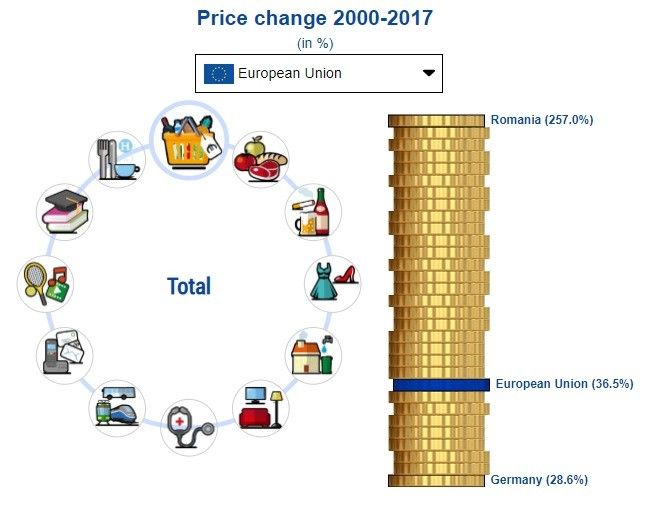 Rata inflației în România depășește 257% pe un interval de timp în care nicio altă țară membră a Uniunii Europene nu are mai mult de 100%.Rata generală a inflației în UE, de la începutul mileniului și până la finele anului trecut, poate fi considerate moderată, dar dacă detaliem pe grupe de produse, observăm variații semnificative la unele categorii.Între 2000 și 2017, prețurile din UE au crescut cu 36% în general, după cum indică datele Eurostat.În același timp, prețurile din România au urcat cu 257%, astfel că la acest capitol suntem campioni europeni.[caption id="attachment_12295" align="alignnone" width="648"]