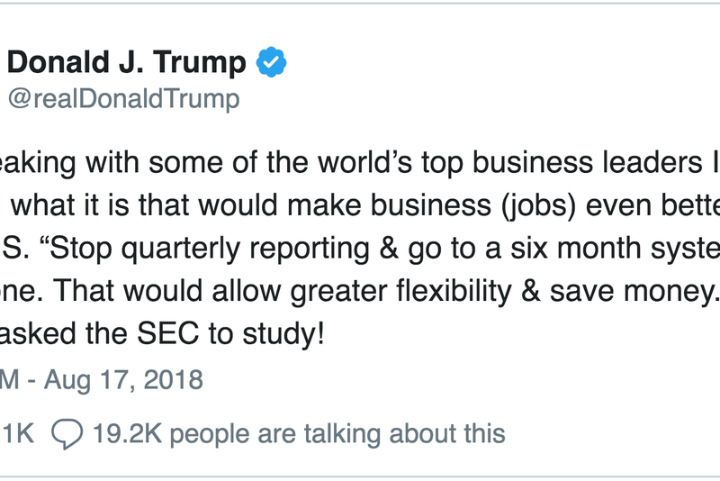 Donald Trump nu contenește să uimească participanții la piețele financiare: vrea pună capăt raportărilor trimestriale privind rezultatele financiare ale companiilor ca o modalitate de a ajuta întreprinderile să "performeze mai bine”.Președintele Donald Trump s-a arătat, vineri, a fi un adept al încetării raportărilor financiare trimestriale privind câștigurile companiilor cotate la bursă, spunând că aceasta va stimula afacerile și, în plus, va contribui la crearea de noi locuri de muncă, conform CNBC.Trump a declarat, într-un tweet, că a discutat cu "lideri de business" despre ideile lor privind creșterea economică și că ei ar fi considerat că necesitatea raportării privind câștigurile o dată la fiecare trei luni reprezintă un obstacol în calea creșterii activității lor. În plus, o idee ar fi aceea de a raporta datele financiare la fiecare șase luni.