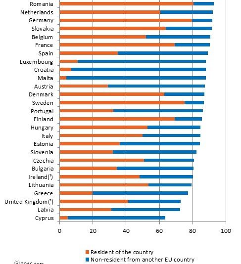 Majoritatea turiștilor care se cazează în unitățile de primire din România sunt români, țara noastră ocupând locul 2 în UE după acest criteriu.Anul trecut, cetățenii Uniunii Europene au efectuat 1,2 miliarde de călătorii turistice - marea majoritate a acestora (94%) aflându-se în destinații din UE, adesea în țara lor de reședință.Cifrele privind numărul de nopți petrecute în UE pentru cazare turistică în 2017 arată că pentru UE în ansamblul său, jumătate din nopțile de cazare (52%) au fost cumpărate de persoane care locuiau în țările raportoare, iar 35% de nerezidenți din alte țări ale UE. Turiștii din afara UE au reprezentat restul de 13% din nopți.Cea mai mare proporție de șederi peste noapte efectuate de rezidenții din țară față de nerezidenți proveniți din alte țări ale UE a fost anul trecut în Polonia, unde 94% din totalul turiștilor au fost localnici și numai 6% proveneau din alte state.România se clasează pe locul 2 la acest capitol, cu 93% turiști români și 7% turiști străini.