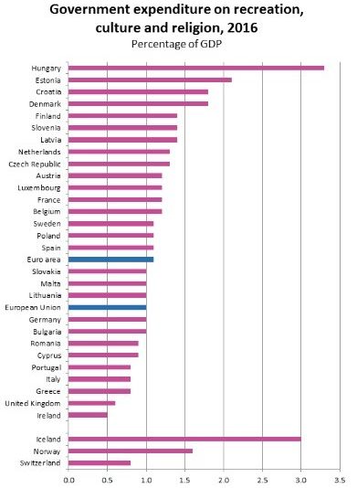 Numai șase țări membre ale Uniunii Europene cheltuiesc pe activitățile de recreere, cultură și religie mai puțin decât România.De la an la an, alocările României pentru acest domeniu au scăzut, astfel că am coborât de la un nivel aflat peste media UE, la unul sub medie.Cheltuielile administrației publice pentru activități de recreere, cultură și religie în Uniunea Europeană (UE) au fost de 1,0% din Produsul Intern Brut (PIB) în 2016, nivel similar celui înregistrat anul anterior, informează un comunicat publicat de Eurostat.În zona euro, cifra a fost ușor mai ridicată (1,1%), de asemenea neschimbată din 2015.[caption id="attachment_13408" align="alignnone" width="391"]