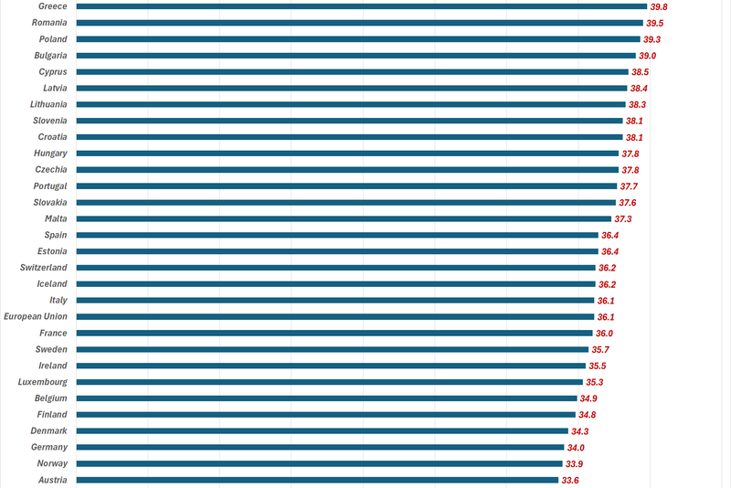 Cele mai lungi săptămâni de lucru au fost înregistrate în Grecia (39,8 ore), România (39,5), Polonia (39,3) și Bulgaria (39,0).