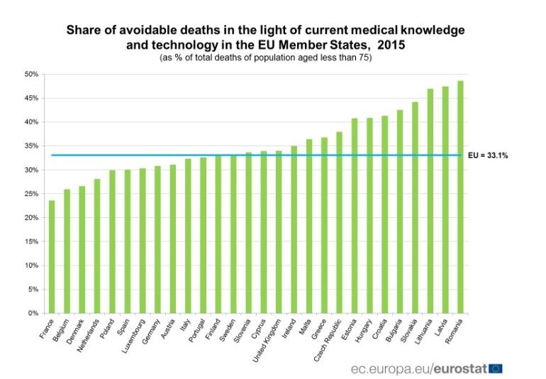 România este țara din UE cu cel mai mare procentaj de decese care puteau fi evitate dacă ar fi existat îngrijire medicală corespunzătoare.În Uniunea Europeană, au murit 1,7 milioane de persoane cu vârste sub 75 de ani, în anul 2015. Dintre aceste decese, mai mult de 570.000 (33,1% din total) pot fi considerate ca "înainte de vreme", respectiv morți care puteau fi evitate, informează un comunicat publicat vineri de Eurostat.Cu alte cuvinte, un deces din trei puteau fi evitate în condițiile actuale de tehnologie și cunoștințe.Cea mai frecventă cauză, din acest punct de vedere, este infarctul, cu peste 180.500 sau 32% din totalul deceselor evitabile. Pe locurile următoare după acest criteriu se situează atacul cerebral (89.600 decese, 16% din total), cancerul de colon (66.800 decese, 12% din total), cancerul de sân (49.900 decese, 9% din total), hipertensiunea (30.400 decese, 5% din total), pneumonia (26.000, în jur de 5% din total).[caption id="attachment_5116" align="alignnone" width="770"]