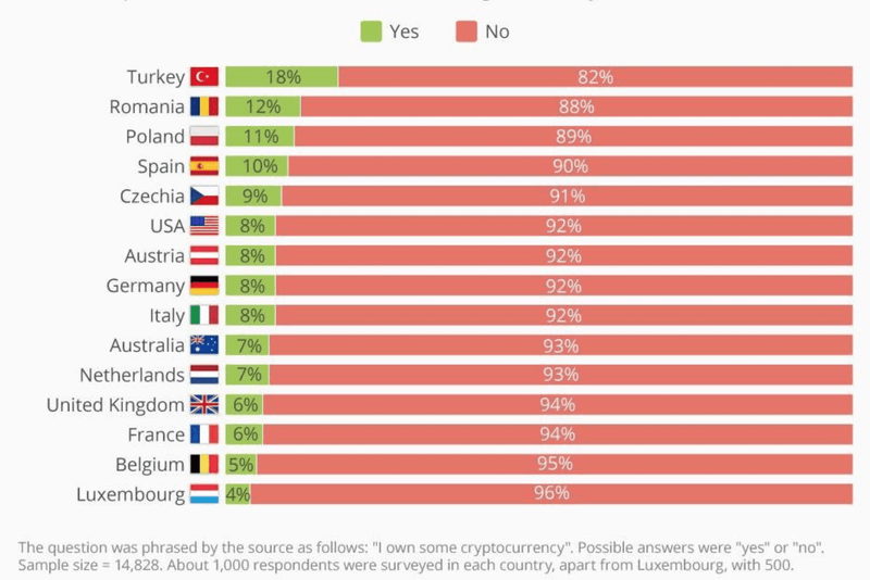 Conform cercetărilor efectuate de Statista pe 15.000 de persoane, Turcia deține în prezent cel mai mare număr de persoane care dețin criptovalute. Conform cercetării citate de site-ul xbt.net, 18% dintre subiecții din acea țară dețin deja Bitcoin sau alte criptomonede.