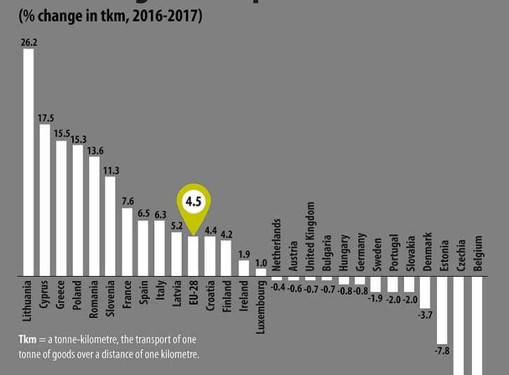 România are un volum mic al transportului rutier de mărfuri, dar a realizat a cincea creștere din Uniunea Europeană în 2017.Transportul rutier de mărfuri în UE, exprimat în tone-kilometri (tkm), a crescut anul trecut cu 4,5% față de 2016, arată datele Eurostat.Între 2013 și 2017, creșterea a fost de 11,8%.Patru state membre au înregistrat în 2017 o creștere de peste 15% a transportului rutier de mărfuri: Lituania (+ 26,2%), Cipru (+ 17,5%), Grecia (+ 15,5%) și Polonia (15,3%).În acest top, România ocupă locul 5, cu 13,6%.În schimb, cele mai mari scăderi au fost înregistrate în Belgia (-13,4%), Cehia (-12,0%) și Estonia (-7,8%).