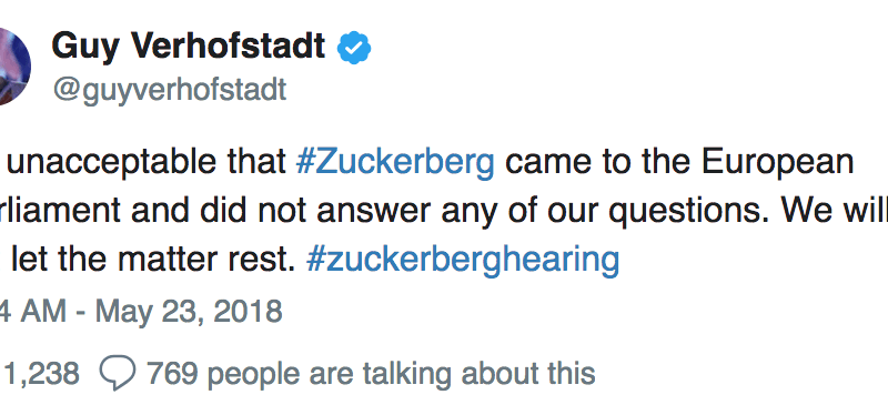 Audierile lui Mark Zuckerberg din Parlamentul European au fost catalogate drept un eșec. Acest fapt s-a răsfrânt pozitiv asupra cotațiilor acțiunilor Facebook, acestea tranzacționându-se în creștere pe Wall-Street, piața dând un bonus de încredere fondatorului celui mare site de socializare din lume.Mark Zuckerberg a evitat răspunsurile la o mulțime de întrebări adresate de către deputații din Parlamentul European, în mare parte datorită constrângerilor de timp și a unui format de întâlnire bizar, care a lăsat la latitudinea fondatorului și CEO-ului Facebook daca să răspundă sau nu."I-am adresat șase întrebări la care putea răspunde cu da sau nu, dar nu am primit decât un singur răspuns", a declarat Philippe Lamberts, membru belgian al Parlamentului European, la încheierea ședinței parlamentare.Zuckerberg s-a întâlnit cu liderii Uniunii Europene pentru cea de-a treia apariție în fața autorităților de reglementare pentru a oferi explicații în urma scandalului Cambridge Analytica. Oficialii UE, care au fost sensibil mai duri în relațiile cu companiile din Silicon Valley decât omologii lor americani și, de asemenea, mult mai preocupați de aspectele ce țin de viața privată si caracterul confidențial al datelor, au pus întrebări dificile despre profilurile din umbră, colectarea și urmărirea datelor precum și despre influența pe care o are Facebook în piețele de marketing.Membrii Parlamentului European au adresat întrebări în bloc pentru primele 60 de minute, în timp ce Zuckerberg doar a luat notițe. El a început să răspundă la întrebări, însă cu doar 7 minute rămase din timpul alocat.Mark Zuckerberg a conștientizat limitările temporale și a încercat să încheie reuniunea după aproximativ 15 minute de la expirarea termenului-limită, ducând la exasperarea clară a mai multor oficialități din UE.