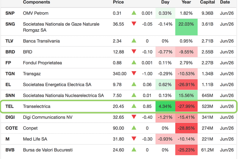 Dinamica din 26 iunie a constituenților indicelui BET, sursa: tradingeconomics.com