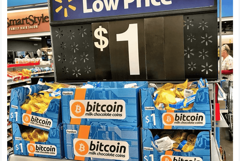 Gigantul de retail Walmart a început să vândă Bitcoin la prețul de doar un dolar, deși prin intermediul unui desert și nu criptomoneda propriu-zisă, cea cu care am devenit atât de obișnuiți.Într-adevăr, datorită Frankfort Candy & Chocolate, un producător de bomboane din Philadelphia, denumirea de Bitcoin a început să pătrundă în magazinele Walmart din America.Conform cryptocoinspy.com o un fotograf a publicat o poză în care se poate lesne vedea o zonă cu produse promoționale din care fac parte cu cel puțin nouă cutii de monede de ciocolată cu lapte Bitcoin.După cum se poate vedea în imaginea de mai jos, Walmart vinde produsul de cofetărie Bitcoin pentru 1 dolar. Membrii comunității au avut o zi de campanie cu sloganul "prețuri reduse în fiecare zi” care însoțește dispunerea ciocolatelor Bitcoin.