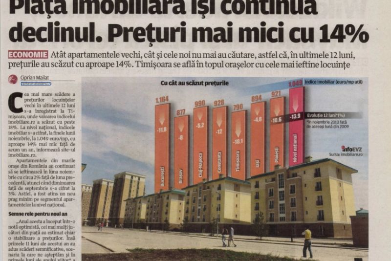 După criza economică din 2008–2010, prețurile imobiliare din România au scăzut semnificativ, însă nivelul exact al reducerii variază în funcție de surse: