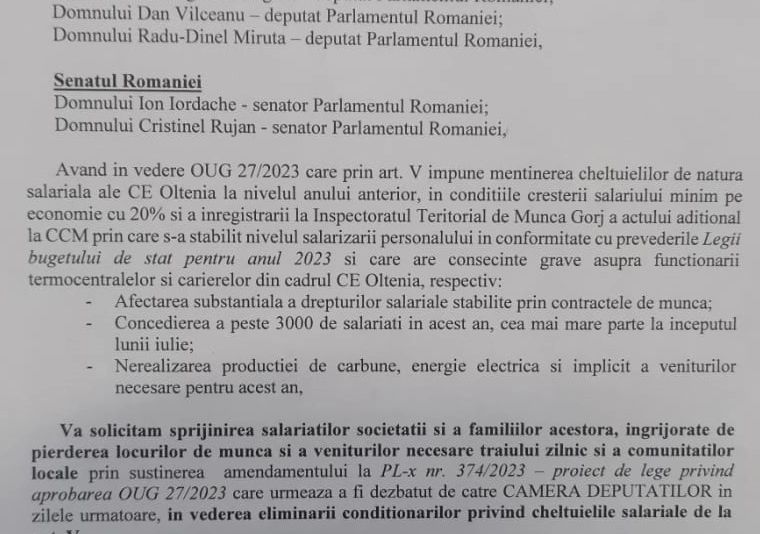 Sindicatele din Complexul Energetic Oltenia îi avertizează pe ministrul Energiei și pe parlamentarii de Gorj că există riscul ca circa 3.000 de angajați să fie dați afară, din nevoia de a meniține cheltuielile salarile la nivelul de anul trecut.
