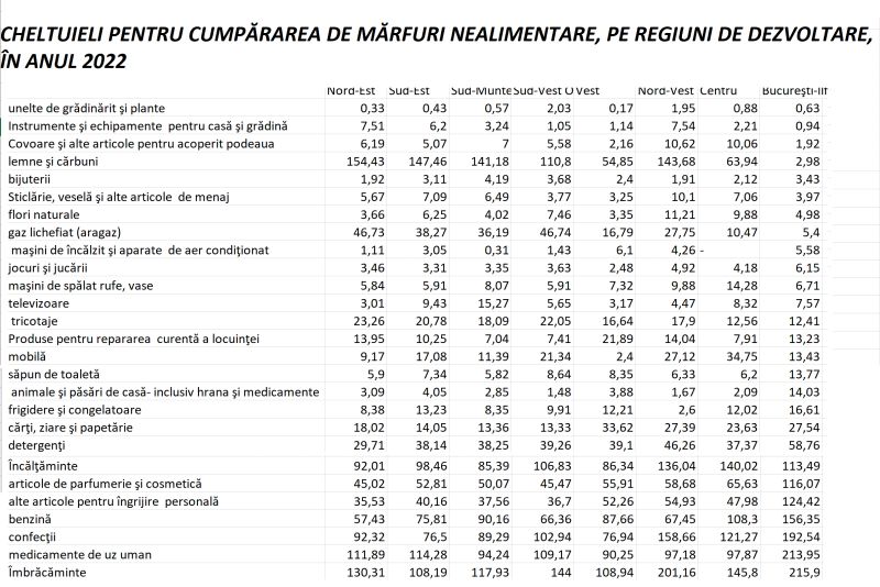 Statistica prezentată de INS a analizat cheltuielile românilor în anul 2022. Rezultatele acesteia prezintă diferențe notabile între regunile României. Aceste diferențe regionale în cheltuieli pot fi influențate de o varietate de factori, cum ar fi clima, nivelul de trai, tipul de muncă și preferințele culturale.