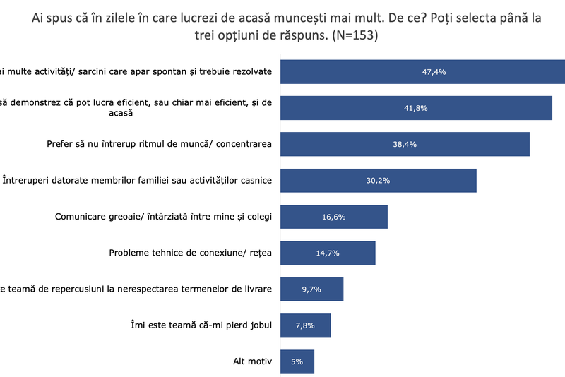 Pe de altă parte, 35% spun că nu au observat un tipar sau lucrează la fel de mult în ambele situații, iar cei mai puțini, 28%, sunt de părere că muncesc mai mult de la birou, arată studiul desfășurat în perioada 30 octombrie – 4 noiembrie de agenția de cercetare de piață Wisemetry Research..Principalele motive ale unui program de muncă prelungit de acasă sunt: