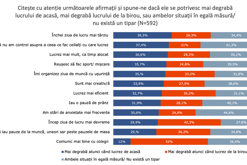 Peste o treime dintre respondenți consideră că sunt mai creativi atunci când muncesc de acasă, în timp ce un sfert apreciază că munca de la birou îi ajută să fie mai creativi.În plus, munca de acasă pare să încurajeze și adoptarea unor obiceiuri de viață sănătoase, precum luarea mesei de prânz și desfășurarea activităților fizice/ sportive.