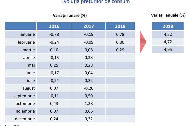 Banca Națională a României (BNR) a publicat, pe site-ul propriu, raportul prezentat de guvernatorul Mugur Isărescu asupra inflației din mai 2018, cele mai recente date fiind aferente lunii martie.Potrivit unui tabel comparativ din cadrul documentului, realizate pe baza datelor Institutului Național de Statistică (INS), prețurile de consum au evoluat mult mai puternic în primele trei luni din 2018 față de perioada similară din anii precedenți.Astfel, dacă în ianuarie și februarie am avut variații lunare negative (prețurile au scăzut) atât în 2016 cât și în 2017, anul acesta s-au înregistrat creșteri de prețuri, cu 0,78% în ianuarie și 0,30% în februarie. În martie 2018 am avut inflație pozitivă, de 0,29%, mai mare decât în aceeași lună din cei doi ani anteriori.Variațiile anuale din primele trei luni ale anului 2018 sunt de 4,32% în ianuarie, 4,72% în februarie, 4,95% în martie. Inflația anuală pentru 2017 a fost de 3,3%, mai mică decât toate aceste trei valori.