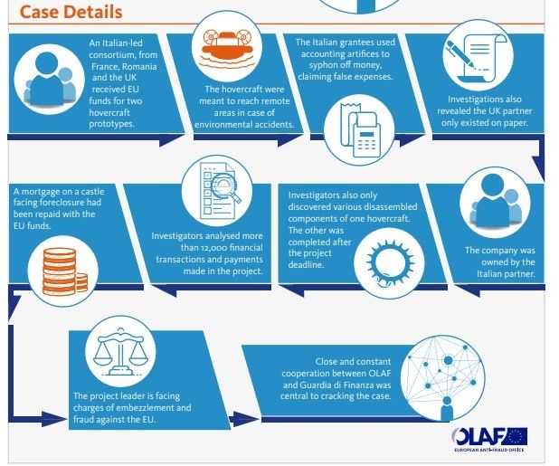 Un mecanism ingenios de deturnare a fondurilor europene pornea din Italia și avea ramificații în România și Marea Britanie.O investigație a Oficiului European de Luptă Antifraudă (OLAF) a dus la anihilarea unui sistem complicat de fraudă prin care au fost deturnate în mod eronat fonduri ale Uniunii Europene în valoare de peste 1,4 milioane euro.OLAF a descoperit modelul de fraudă ca parte într-o investigație privind presupuse nereguli în cadrul unui proiect de cercetare și inovare acordat unui consorțiu european.Consorțiul condus de italieni, cu parteneri din Franța, România și Marea Britanie, a fost însărcinat cu crearea a două prototipuri hovercraft, ce urmau să fie utilizate ca vehicule navale de urgență capabile să ajungă în zone îndepărtate în caz de accidente de mediu, se arată în raportul OLAF pe anul 2017.În timpul controalelor la fața locului efectuate împreună cu Garda Financiară din Italia, au fost descoperite diverse componente dezasamblate ale unui hovercraft, precum și alte hovercraft-uri care au fost finalizate după data limită a proiectului. S-a constatat că, pentru a obține fondurile UE, partenerii italieni au atestat în mod fals existența condițiilor structurale și economice necesare pentru realizarea proiectului.