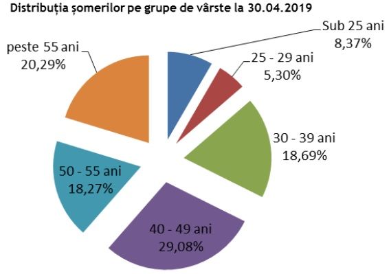 În funcţie de mediul de rezidenţă, numărul şomerilor la finele lunii aprilie se prezintă astfel: 77.452 şomeri provin din mediul urban şi 184.457 şomeri provin din mediul rural.Cei mai mulţi şomeri aveau între 40 şi 49 de ani (76.172), urmaţi de cei din grupa de vârstă peste 55 de ani (53.129), la polul opus aflându-se persoanele între 25 - 29 de ani (13.886).Referitor la structura şomajului după nivelul de instruire, şomerii fără studii şi cei cu nivel de instruire primar au o pondere însemnată în totalul şomerilor înregistraţi în evidenţele ANOFM (33,28%). Şomerii cu nivel de instruire gimnazial reprezintă 31,53% din totalul şomerilor înregistraţi, iar cei cu studii universitare 4,94%.[caption id="attachment_28954" align="alignnone" width="513"]