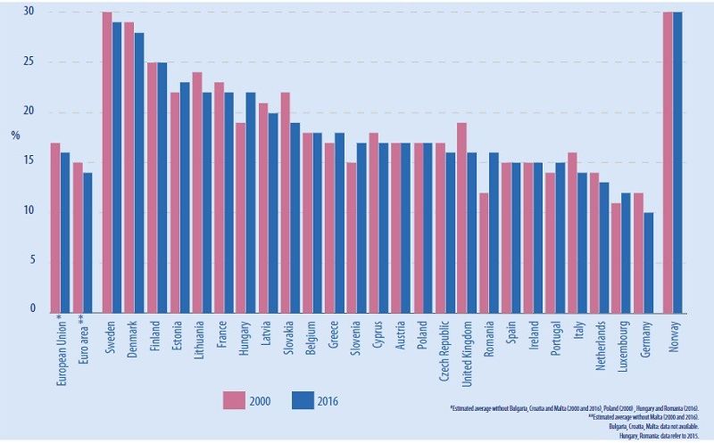 România a înregistrat, în perioada 2000-2016, cea mai mare creștere din UE la ponderea angajaților din sectorul bugetar în totalul salariaților.Numai în 7 țări din UE ponderea bugetarilor în totalul angajaților este mai mică decât în România, care înregistrează însă un trend ascendent.Angajații din sectorul guvernamental reprezentau 16% din totalul angajaților din Uniunea Europeană, în 2016, informează un comunicat publicat luni de Eurostat.Acest procentaj a rămas relativ stabil, oscilând, după anul 2000, între 15% și 17% din total.Categoria salariaților de la stat include funcționarii publici și alți angajați guvernamentali (la nivel național, regional și local), precum și forțele armate.Limitele sectorului guvernamental variază de la un stat membru la altul. De exemplu, în unele țări, locurile de muncă în educație sau sănătate fac parte din ocuparea forței de muncă guvernamentale, iar în altele nu.Ponderea angajaților din sectorul guvernamental[caption id="attachment_7705" align="alignnone" width="807"]