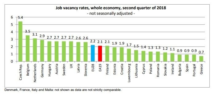 [/caption]Dintre statele membre UE care au prezentat date, cele mai mare rate ale joburilor vacante au fost înregistrate, în al doilea trimestru al acestui an, de Cehia (5,4%), Belgia (3,5%), Olanda (3,1%), Germania (2,9%). La polul opus, se situează Grecia (0,7%), Bulgaria, Spania și Portugalia (toate cu 0,9%).România avea o rată de 1,3% sensibil mai mica decât media UE.În trimestrul II 2018 față de aceeași perioadă a anului trecut, cele mai puternice salturi au fost înregistrate în Cehia (1,8 puncte procentuale), Letonia (0,8 pp), Cipru (0,6 pp), Ungaria, Olanda și Finlanda (toate cu 0,5 pp).Nivelul a rămas stabil în România, Danemarca, Irlanda, Grecia, Lituania, Malta, Portugalia. Estonia a avut o scădere de 0,3 puncte procentuale.