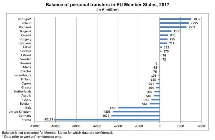 Sursa: Eurostat[/caption]Ca rezultat, cele mai mari surplusuri în transferurile personale au fost înregistrate în 2017 în Portugalia (+ 3,0 miliarde euro), Polonia (+ 2,8 miliarde euro) și România (+ 2,6 miliarde euro).Pe locurile următoare în clasamentul excedentului la transferul de bani se situează Bulgaria (1,1 miliarde de euro), Croația (800 milioane de euro), Ungaria (750 milioane de euro), Lituania (700 milioane de euro), Letonia (200 milioane de euro), Slovacia (170 milioane de euro), Estonia și Suedia (ambele în jur de 70 milioane de euro).Celelalte state membre înregistrează deficit, cele mai mari minusuri fiind în Franța (- 10,1 miliarde euro), Germania (- 4,6 miliarde euro), Marea Britanie (- 4,5 miliarde euro) și Italia (- 4,0 miliarde euro).