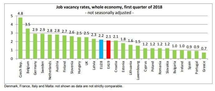 România are puține joburi libere și este una dintre cele patru țări UE în care rata locurilor de muncă vacante a scăzut în primul trimestru.Rata joburilor vacante a fost, în Uniunea Europeană, de 2,2% în primul trimestru al acestui an, în creștere de la 2,0% în trimestrul precedent și de la 1,9% în primele trei luni din 2017, se arată într-un comunicat publicat de Eurostat.În zona euro, rata locurilor de muncă vacante a fost de 2,1% în T1 2018, mai mare decât cea înregistrată în T4 2017, de 2,0% și decât cea de 1,9%, în primul trimestru al anului trecut.În primul trimestru, rata joburilor vacante a fost în zona euro, de 1,9% în industrie și construcții și de 2,4% în servicii, iar în UE, de 2,0% în industrie și construcții și de 2,4% în servicii.[caption id="attachment_4070" align="alignnone" width="690"]