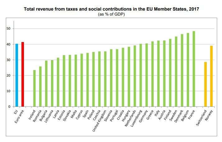 Dintre statele membre ale Uniunii Europene, România are a doua cea mai mică pondere a taxelor în Produsul Intern Brut (PIB), după Irlanda.Aceasta, în condițiile în care PIB-ul nostru este de circa 200 miliarde de euro la o populație de 20 milioane de locuitori, iar Irlanda are un PIB de 300 miliarde de euro la 5 milioane de locuitori.Ponderea totală a impozitelor în PIB a fost anul trecut în Uniunea Europeană de 40,2%, în creștere de la 39,9% în 2016, conform datelor Eurostat.Indicatorii fiscali sunt compilați într-un cadru armonizat bazat pe Sistemul european de conturi (ESA 2010), care permite o comparație exactă, între statele membre, a sistemelor fiscale și a politicilor fiscale.