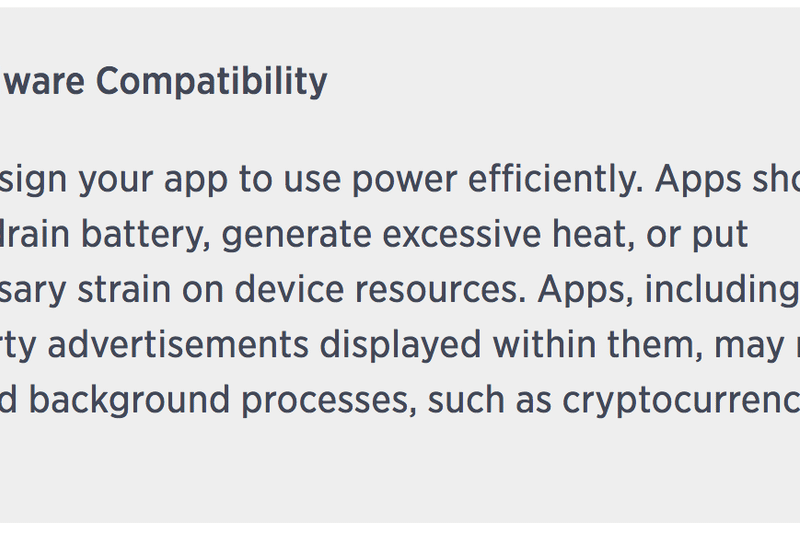 Apple și-a actualizat liniile directoare pentru dezvoltatori, interzicănd în mod explicit minarea de criptovalute, cum ar fi Bitcoin.Noile reguli restricționează aplicațiile care consumă excesiv bateria, generează căldură de la procesor sau consumă inutil resursele dispozitivului. Interesant este că toate toate acestea au loc în procesul de minare (descoperire) de Bitcoin."Aplicațiile, inclusiv orice anunțuri publicitare afișate în ele, nu pot rula procese de fundal independente, cum ar fi minarea de criptomonede", a declarat Apple pe site-ul său.Este puțin probabil ca cineva să reușească cu succes să mineze de pe un iPhone sau iPad, din cauza cantității de energie și a puterii de calcul necesare. Dar, acest demers al Apple ar putea să oprească în mod preferențial viitoarele procese de căutare de monede digitale cu consum redus de energie. În plus, nici realizarea acestui proces prin intermediul a mai multor dispozitive ar putea fi interzisă.