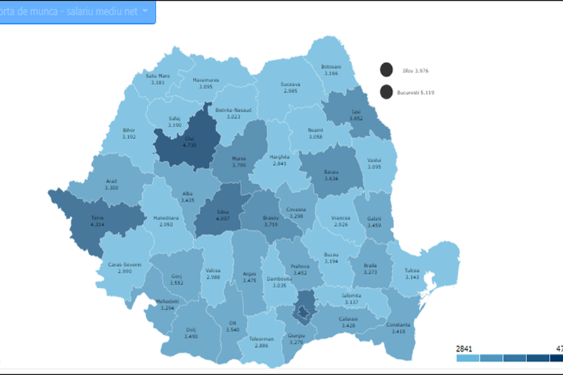 Dacă Bucureștiul este singurul județ al țării cu salariul mediu net peste 5000 de lei (5119 lei), topul este continuat cu trei județe din interiorul Carpaților, Cluj, Timiș și Sibiu, singurele din țară cu salariul mediu net de peste 4000 de lei. Iașiul este abia pe locul 6 (3852 de lei) deși este județul cu cea mai mare pondere a celor cu diplomă universitară după București, iar cele mai mici salarii le vom găsi în Harghita ( 2841 de lei), Teleorman (2886 de lei) și Vrancea (2926 de lei).