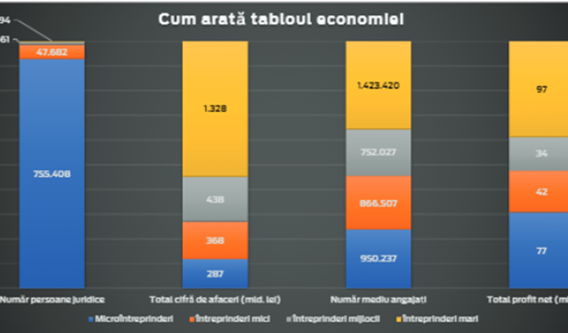 Structura economiei noastre este, sintetic, următoarea: 755 000 de microîntreprinderi (maxim 9 salariați, maxim 2 milioane de euro cifră de afaceri), 47 000 de întreprinderi mici (maxim 49 salariați, maxim 10 milioane de euro cifră de afaceri) , 8600 de întreprinderi medii (maxim 249 salariați, maxim 50 milioane de euro cifră de afaceri) și 2000 de întreprinderi mari.