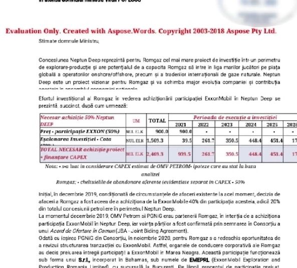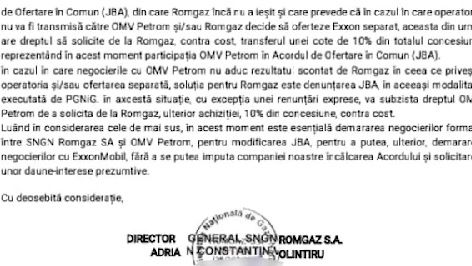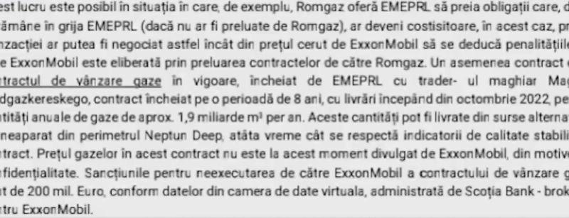 „Și acum... bomba. În 10 decembrie 2020, cu cateva saptamani înainte să fie schimbat de la conducerea companiei, directorul general Romgaz îi scrie o scrisoare lui Virgil Popescu, ministrul Energiei, în care îi spune: Ai de ales între două chestiuni - să cumpărăm acțiunile societății Exxon MBRL sau să cumpere unele active ale Exxon Mobile, care sunt legate de această explorare, adică dreptul de a exploata zăcământul, zăcământul rămâne al statului, e proprietate publică. Dl Volintiru (Adrian Volintiru, n.r.) îi spune ministrului Popescu ce înseamnă dacă va cumpăra Romgaz acțiunile acestei firme Exxon Mobile. Înseamnă că va cumpăra niște obligații pe care Exxon Mobile le are.