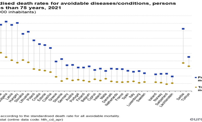 La un clasament global al statelor europene din punct de vedere al ponderii la 100 000 locuitori a deceselor celor sub 75 de ani din cauze care puteau fi ocolite, România este pe primul loc european la femei și pe II la bărbați, în vreme ce Spania are a patra cea mai mică pondere europeană a cestor decese, Portugalia și Slovenia se află la mijlocul clasamentului european, iar Cehia și Slovenia sunt și ele cu ponderile respective la jumătate din valorile înregistrate la noi: