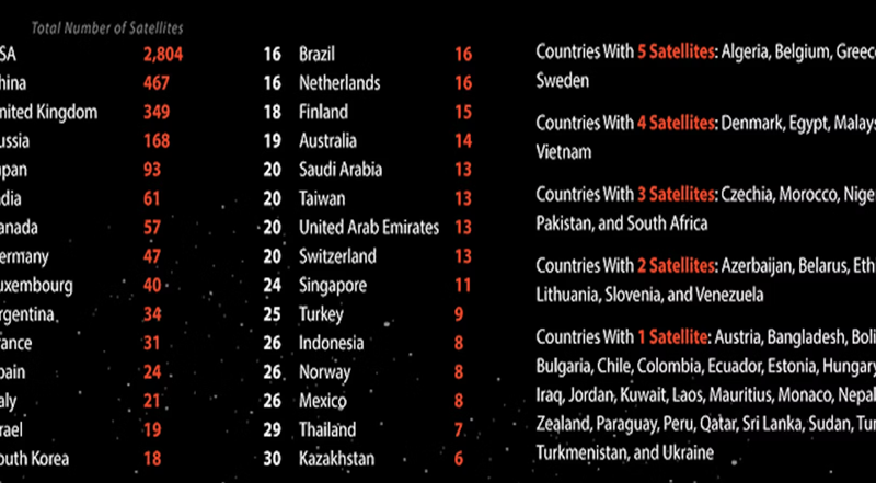 Printre națiunile care au proprii sateliți în jurul pământului, în fruntea clasamentului găsim Statele Unite, care deține peste jumătate din sateliții întregii planete (peste 2800). China, puterea tehnologică cu creșterea cea mai importantă din ultimii ani, este pe locul II, cu 467 de sateliți, urmată de către Marea Britanie (349 de sateliți) și Rusia (168 de sateliți). Statele din Uniunea Europeană care dețin proprii sateliți nu sunt puține: Germania are 47, Luxemburgul 40, Franța 31, Spania 24, Italia 21, Olanda 16, Finlanda 15, Belgia, Grecia și Suedia câte 5, Danemarca 4, Cehia 3, Lituania și Slovenia câte 2, iar Austria, Bulgaria, Ungaria, Estonia, câte 1. În total 18 națiuni din UE sunt în acest club select, din care mai fac parte și state precum Kazahstan (6 sateliți), Algeria (5 sateliți), Maroc și Pakistan (câte 3 sateliți), Azerbaidjan, Belarus și Venezuela (câte 2 sateliți), ba chiar și Bangladesh, Ecuador, Kuweit, Laos, Sri Lanka, Sudan, Tunisia, Turkmenistan și chiar Irak.