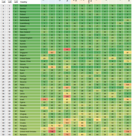 De altfel, prosperitatea pare un atribut strict european: primele 9 state în acest clasament sunt toate europene și abia pe locul 10 găsim un stat din afra continentului nostru, Noua Zeelandă. A doua decadă a clasamentului cuprinde și Canada (pe locul 13), Australia (locul 15), Japonia (pe locul 16), Singapore (locul 17) și Statele Unite (locul 19). pe locul 20 regăsim Republica China, cunoscută și sub numele de Taiwan.