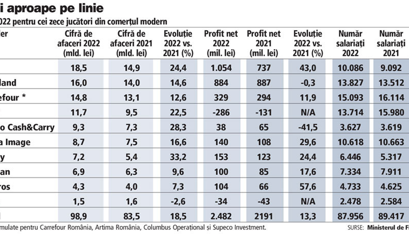 Să încheiem cu o tușă umoristică, observând că anul trecut, atunci când nouă ne clănțăneau dinții de frică când vedeam prețurile din magazine, primele 10 rețele de supermarketuri din țară au avut vânzări de aproape 100 de miliarde de lei și au raportat un profit de doar 2,48 miliarde de lei: