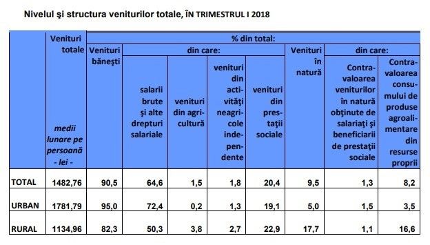 După ce își plătește mâncarea și curentul electric, românul rămâne cu prea puțini bani pentru investiții, care însumează doar 0,3% din cheltuieli.Veniturile totale medii lunare au reprezentat în trimestrul I 2018, în termeni nominali, 3.873 lei pe gospodărie şi 1.483 lei pe persoană, potrivit unui comunicat publicat vineri de Institutul Național de Statistică.Cheltuielile totale ale populaţiei, au fost, în trimestrul I 2018, în medie, de 3.317 lei lunar pe gospodărie (1.270 lei pe persoană) şi au reprezentat 85,6% din nivelul veniturilor totale.Veniturile băneşti au fost, în medie, de 3.505 lei lunar pe gospodărie (1.342 lei pe persoană), iar veniturile în natură de 368 lei lunar pe gospodărie (141 lei pe persoană).Salariile şi celelalte venituri asociate lor au format cea mai importantă sursă de venituri (64,6% din veniturile totale ale gospodăriilor). [caption id="attachment_5682" align="alignnone" width="624"]