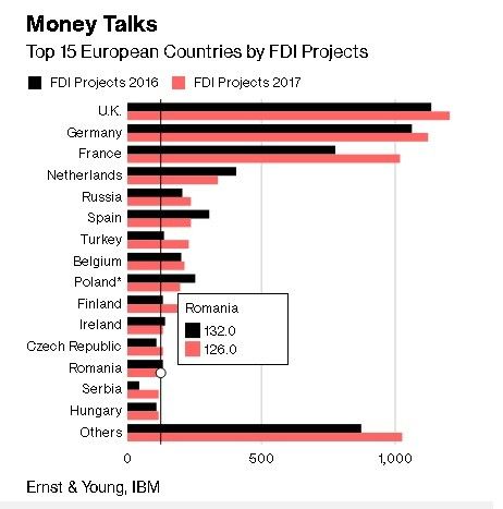 România se află pe locul 13 în topul primelor 15 ţări europene în funcţie de numărul proiectelor de investiţii străine directe.Într-un clasament pe acest criteriu publicat luni de IBM şi Ernst & Young (EY), depășim Serbia și Ungaria, dar suntem în urma Cehiei și Poloniei, după cum transmite Bloomberg, citat de Agerpres.Statele din Europa Centrală şi de Est (CEE) ar putea fi victimele propriului lor succes, conform raportului bazat pe un studiu realizat în rândul a 502 companii şi a datelor de la EY şi IMB.Deşi puterea lor de atracţie încă este robustă, convergenţa principalelor economii din Europa Centrală cu statele din Europa Occidentală pare să-i facă pe investitori mai atenţi. De asemenea, investitorii reacţionează la semnalele privind schimbările politice din unele ţări, care sunt vulnerabile la populism, se arată în raport.În acelaşi timp, se observă mutarea activităţilor unde este nevoie de un efort intens al forţei de muncă spre frontierele Europei.Au crescut investiţiile directe externe în Rusia şi Turcia - două economii în creştere, cu o populaţie numeroasă, de la frontiera Europei - şi în Serbia. Aceste trei state au câştigat împreună cu 200 de proiecte mai mult în 2017 decât în 2016.