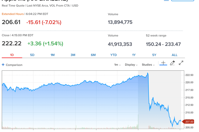 Compania cu sediul în Cupertino, California, prognozează venituri totale pentru următorul trimestru în intervalul 89 de miliarde dolari - 93 de miliarde dolari, din nou sub estimările din piață, care indicau o cifră de 93,02 miliarde de dolari.Acțiunile Apple au scăzut, imediat după anunț, cu peste 7%, la 206,6 dolari, în special din cauza faptului că, pe parte de iPhone, numărul unităților vândute s-a situat sub estimările de pe Wall-Street.