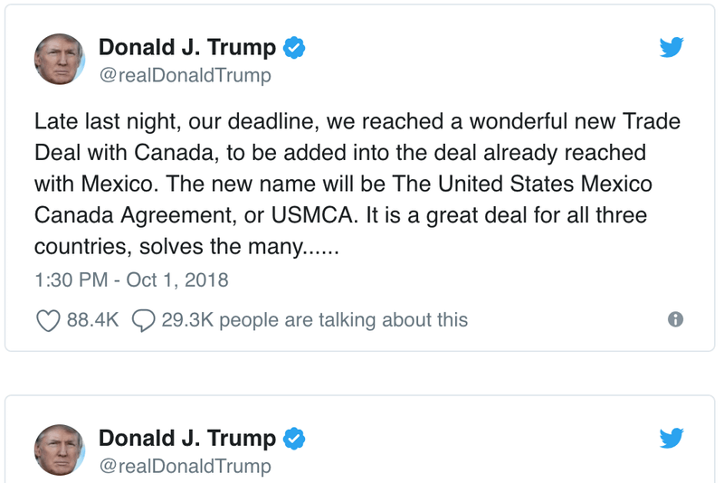 Indicii nord-americani s-au situat în teritoriu pozitiv, luni, ca urmare a faptului că Statele Unite și Canada finalizat cu succes negocierile în privința unui acord comercial.Indicele Dow Jones a crescut cu 0,73% la 26.651 de puncte , S&P500 cu 0,36% la 2.924 de puncte, în timp ce indicele Nasdaq Composite de tehnologie a rămas staționar, închizând la puțin peste pragul de 8.000 de puncte.Cele două țări au convenit asupra unui acord care să înlocuiască acordul de liber-schimb din America de Nord, NAFTA, cu puțin timp înainte de termenul limită de la miezul nopții.NAFTA (North American Free Trade Agreement) a avut o durată de 24 de ani, și a fost declarat ca fiind un „dezastru” de către președintele Donald Trump, va fi înlocuit de USMCA (United States-Mexic-Canada agreement).Așa cum era de așteptat, Trump și-a arătat satisfacția, ca de obicei, pe Twitter, descriind acest acord trilateral ca fiind unul „minunat”: