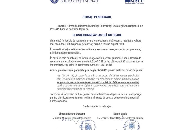 Chiar dacă în decizia de recalculare care v-a fost transmisă recent a rezultat o valoare mai mică decât ultima pensie pe care ași primit-o în luna august 2024", se arată în documentul ce va fi transmis prin poștă tuturor beneficiarilor.